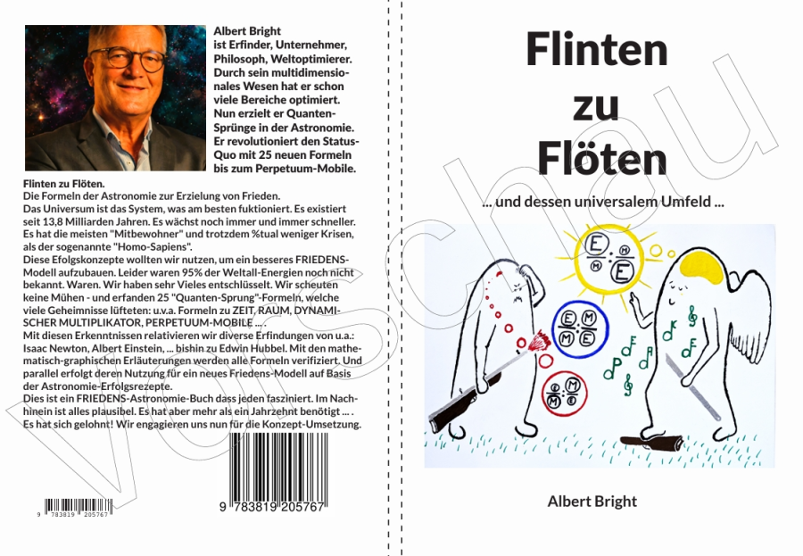 Friedens- und Freiheits-System; und (3.) AstronEffizienzOnomie, ISBN 978-3-7497-9467-6 mit den erfundenen Formeln der „Dynamischen Relativität“ und "Dunklen-Energie", sowie einem starkem Fokus auf